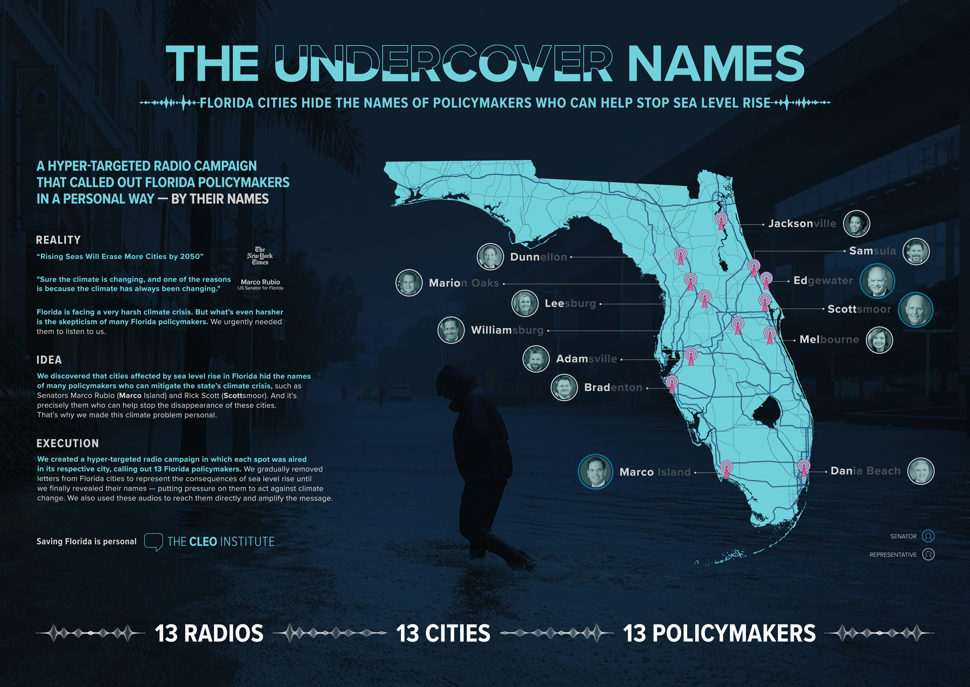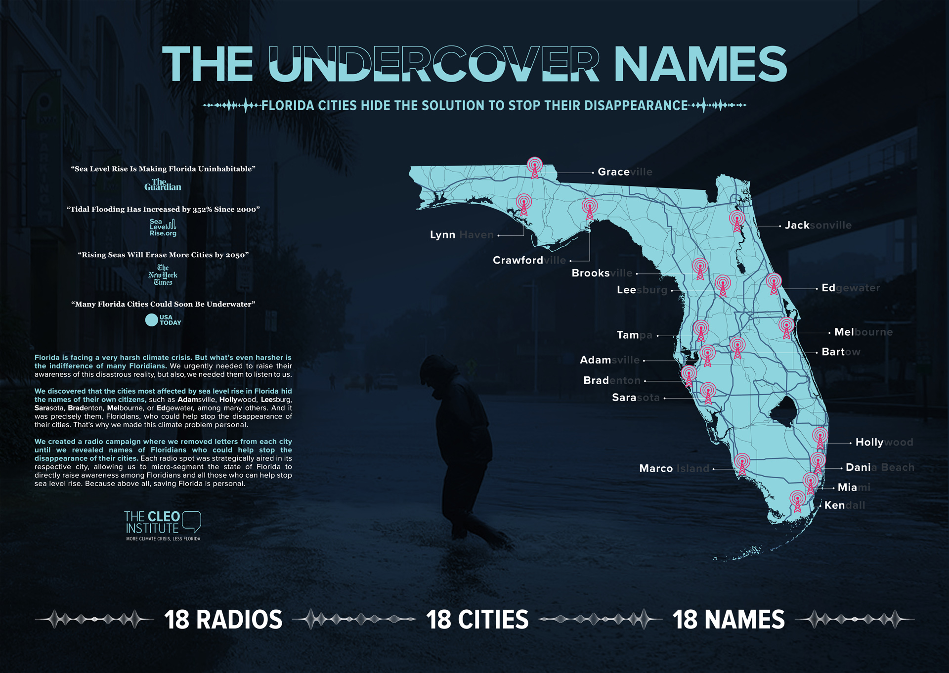 We created a radio campaign where we removed letters from each city until we revealed names of Floridians who could help stop the disappearance of their cities. Each radio spot was strategically aired in its respective city, allowing us to micro-segment the state of Florida to directly raise awareness among Floridians and all those who can help stop sea level rise. Because above all, saving Florida is personal.